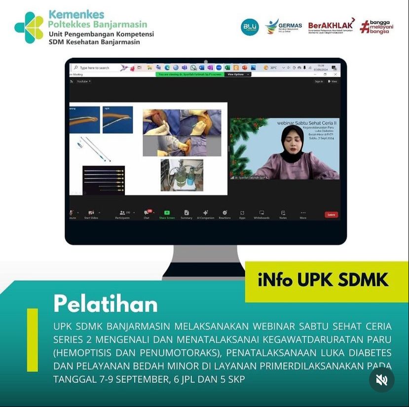 Banjarmasin sukses mengadakan Webinar Sabtu Sehat Ceria Series 2 yang mengangkat tema penanganan kegawatdaruratan paru (hemoptisis dan pneumotoraks), penatalaksanaan luka diabetes, serta pelayanan bedah minor di layanan primer.